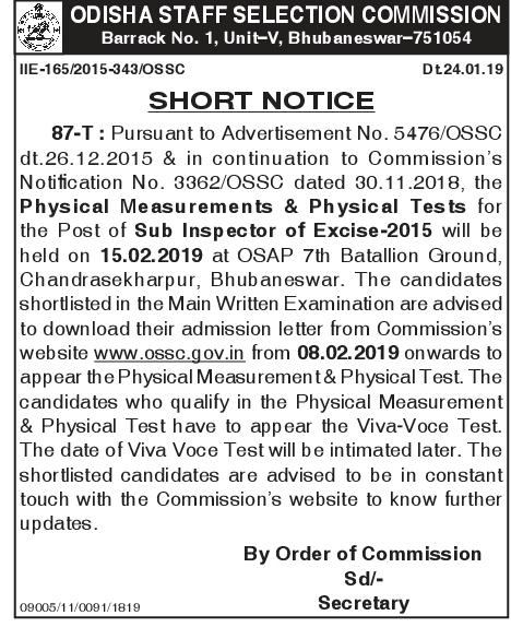 Tests Date for the Post Of Sub Inspectors of Excise - 2015. Those Candidates